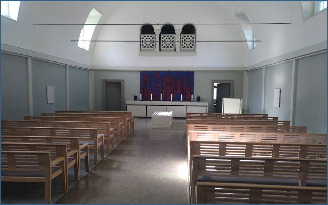 For enden af kapellet står et alterbord med 6 levende lys og en buket blomster i hver side.